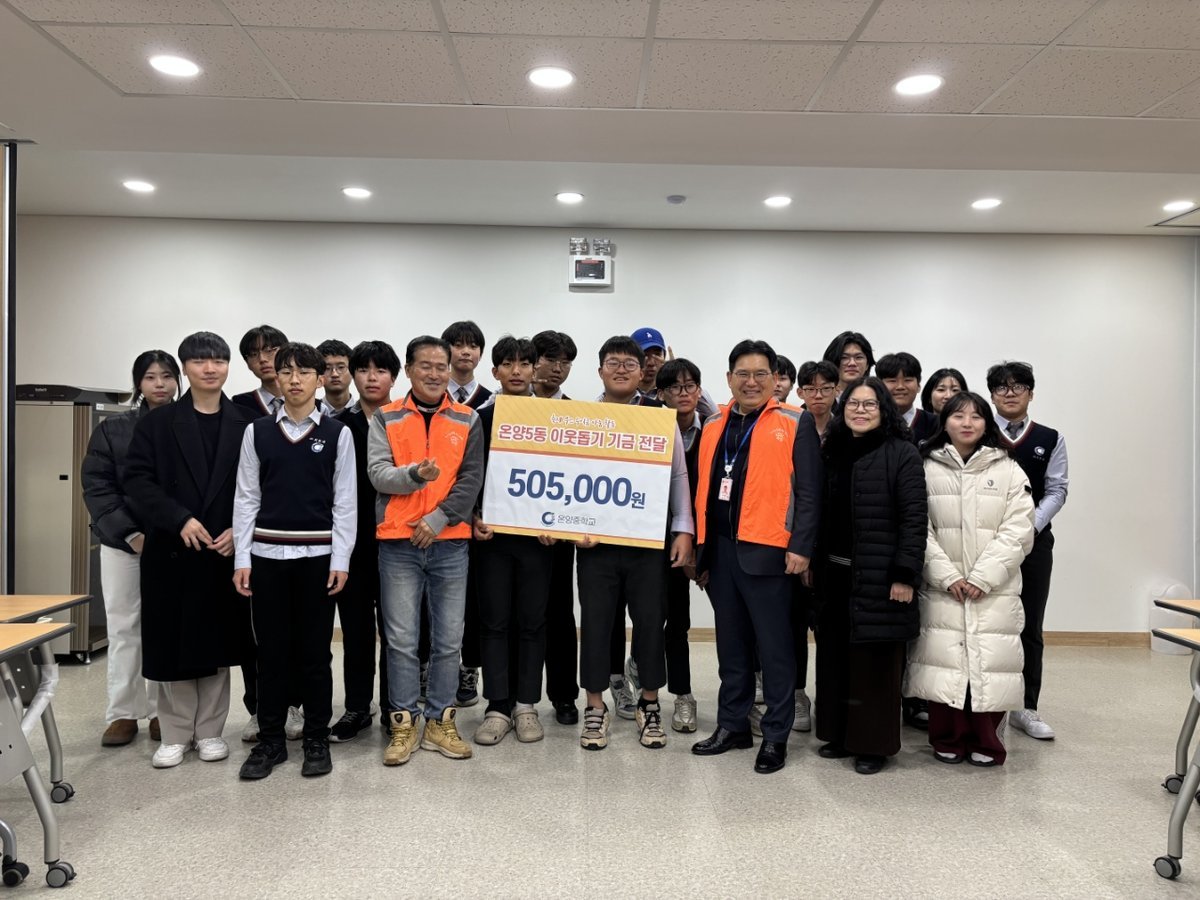 [충청25시] 아산시 온양중학교는 지난 5일, 학교 축제 수익금으로 마련한 후원금 50만 5천 원을 온양5동 행복키움추진단에 전달하며 지역사회 나눔을 실천했다.