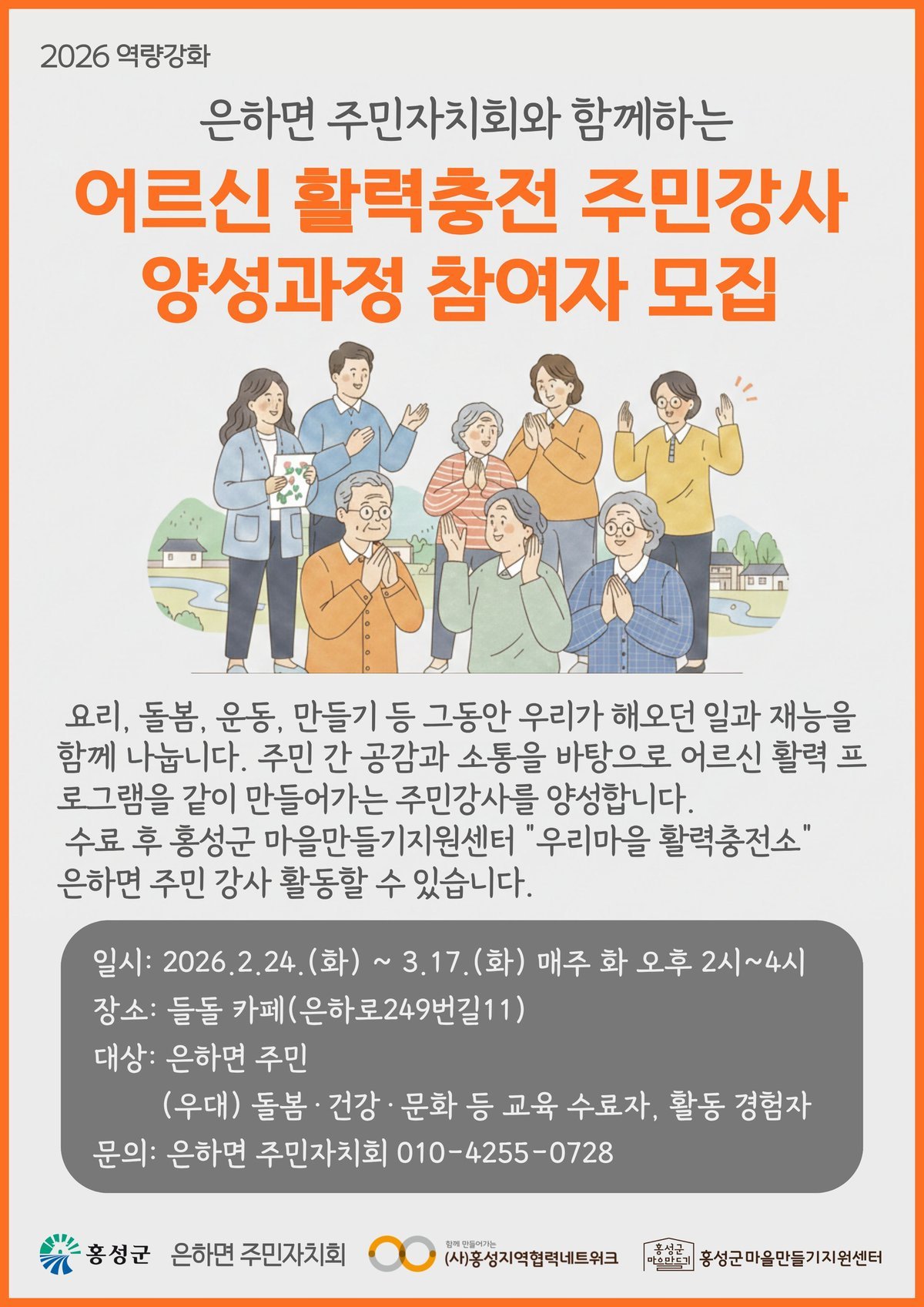 [충청25시] 홍성군 은하면 주민자치회는 홍성군 마을만들기 지원센터와 함께 지역 내 어르신 돌봄과 마을 공동체 활성화를 위해 ‘어르신 활력충전 주민강사 양성과정’참여자를 모집한다.