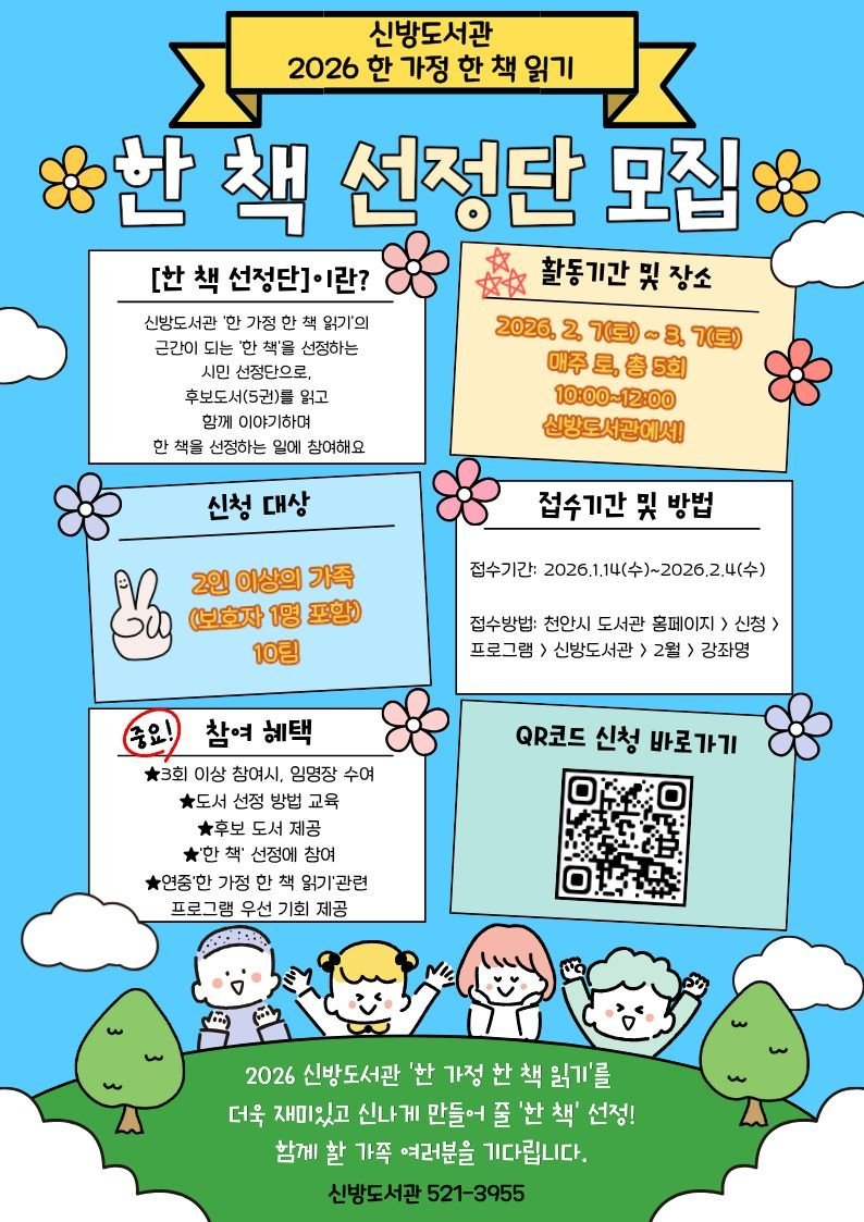 [충청25시] 천안시 신방도서관은 ‘한 책 선정단’참여 가족을 모집한다고 20일 밝혔다.