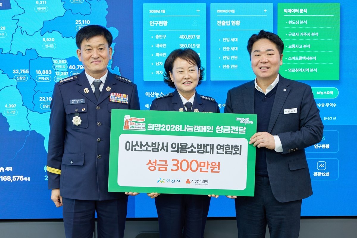 오세현 아산시장은 “재난 현장에서 보여주신 헌신에 더해 따뜻한 나눔까지 실천해 주신 아산소방서 의용소방대연합회에 깊이 감사드린다”며 “전해주신 소중한 성금은 도움이 필요한 이웃들에게 정성껏 전달해, 더욱 안전하고 따뜻한 아산을 만드는 데 의미 있게 사용하겠다”고 말했다.