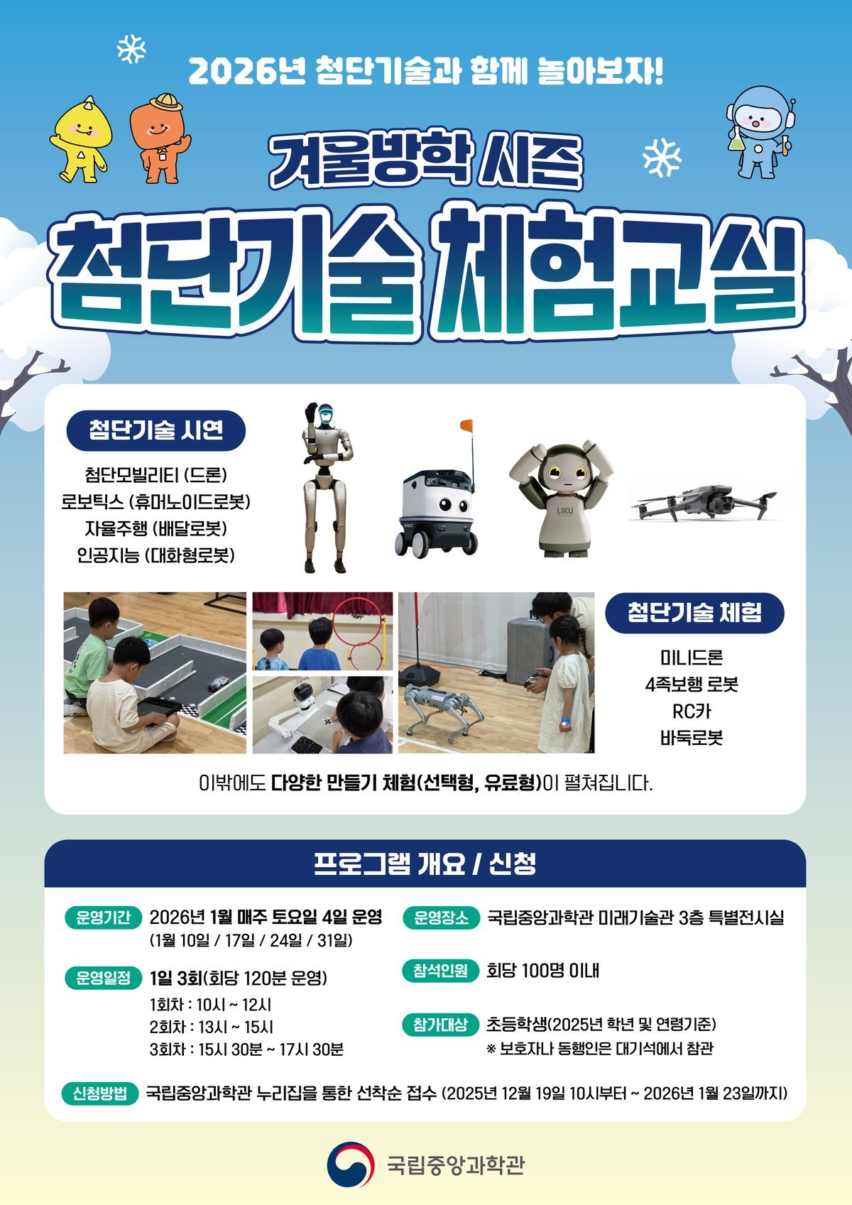 [충청25시] 국립중앙과학관은 겨울방학을 맞이하여 2026년 1월 중 매주 토요일 4일 동안「겨울방학 시즌 첨단기술 체험 교실」을 국립중앙과학관 미래 기술관 3층에서 운영한다고 밝혔다.
