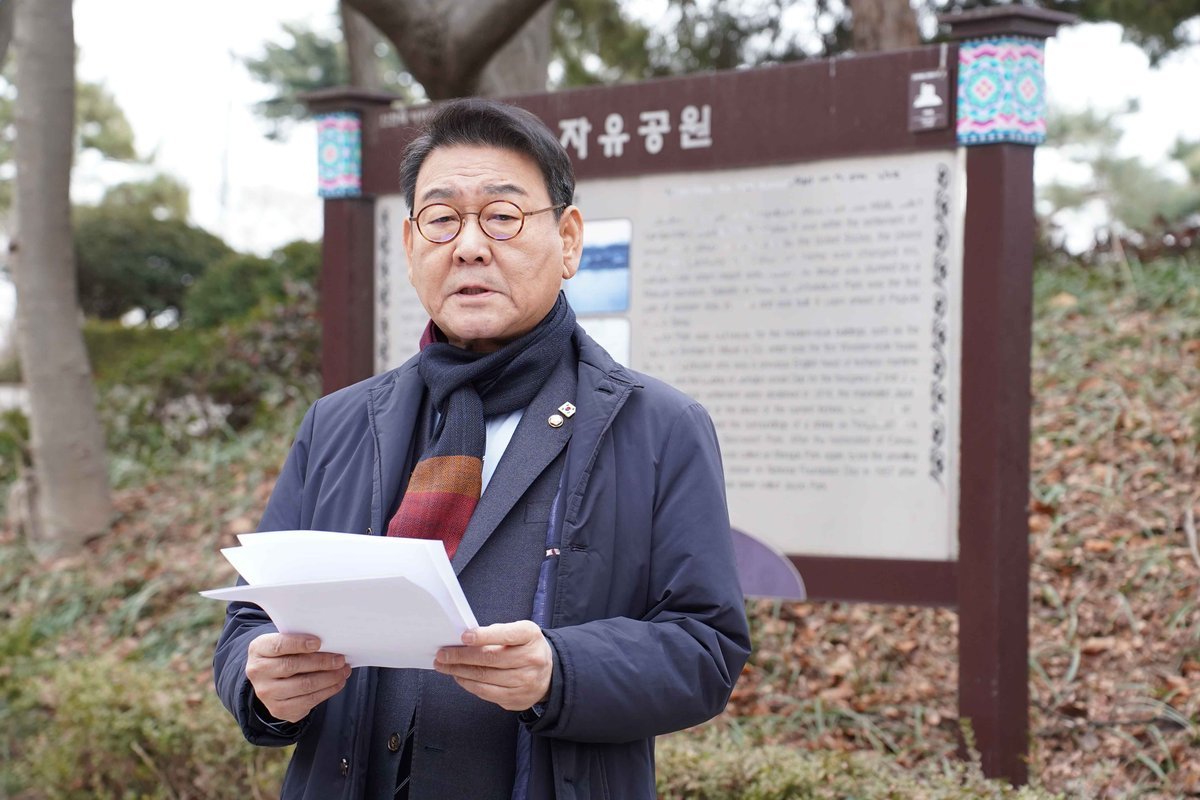 [충청25시] 김교흥 인천 국회의원은 이완석 광복회 인천지부장과 함께 24일 3.1절을 맞아 인천 자유공원을 방문해 한성임시정부 13도 대표자 회의 터를 찾아 독립운동의 역사적 의미를 되새기고 인천 독립운동사 복원과 독립유공자 예우 강화를 약속했다.