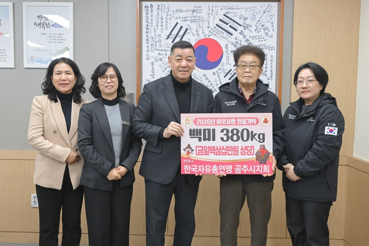 [충청25시] 공주시는 한국자유총연맹 공주시지회가 제14대 회장 취임을 기념해 백미 380kg을 기탁하며 따뜻한 나눔을 실천했다고 밝혔다.