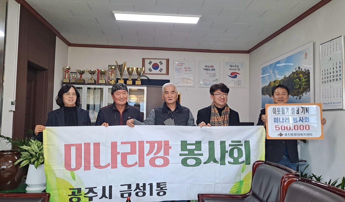 노성자 웅진동장은 “지역사회를 위한 따뜻한 나눔에 동참해 주신 미나리봉사회에 깊이 감사드린다”며 “기탁해 주신 성금은 도움이 필요한 이웃들을 위해 소중히 사용하겠다”고 밝혔다.