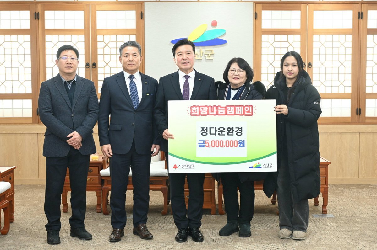 [충청25시] 예산군은 지난 27일 군청 상황실에서 정다운환경이 ‘희망2026 나눔캠페인’이웃사랑 성금 500만원을 기탁했다고 밝혔다.