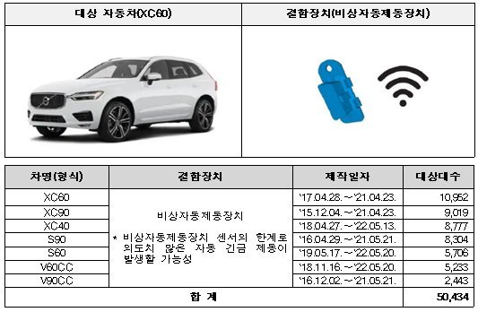 ① XC60 등 7개 차종 50,434대는 비상자동제동장치 센서의 한계로 의도치 않은 자동 긴급 제동이 발생할 가능성으로 1월 26일부터 시정조치를 진행하고 있다.