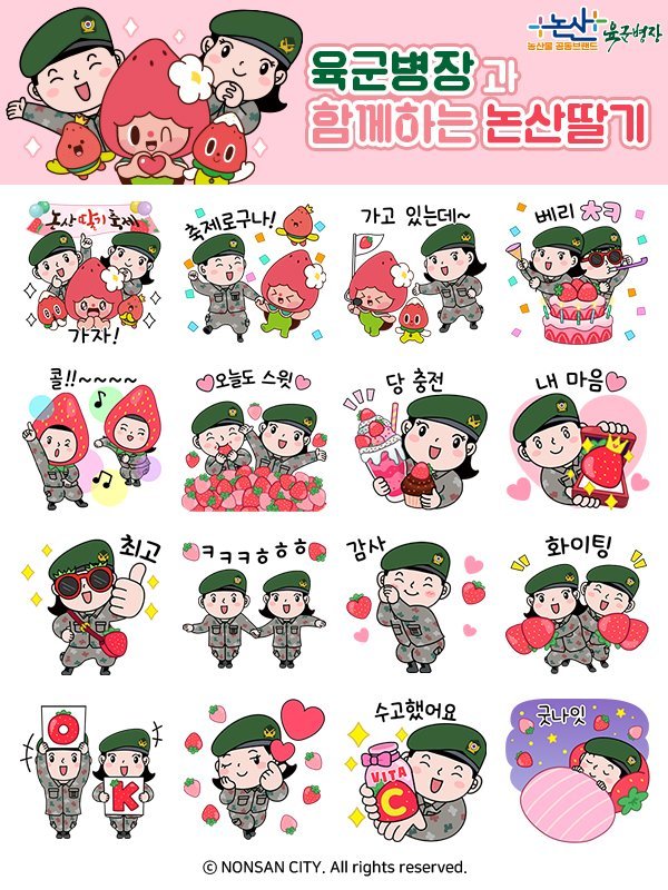 이번에 배포하는 이모티콘은 논산시 농산물 공동브랜드인‘육군병장’과 논산딸기축제 및 2027논산세계딸기산업엑스포 공식 캐릭터인 ‘베리프렌즈’를 결합해 제작했다.