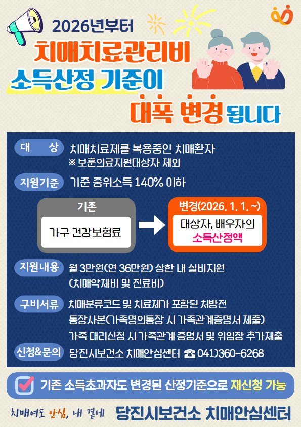 [충청25시] 당진시보건소 치매안심센터는 2026년 1월 1일부터 치매치료관리비 지원사업의 소득 기준 산정 방법이 변경된다고 31일 밝혔다.