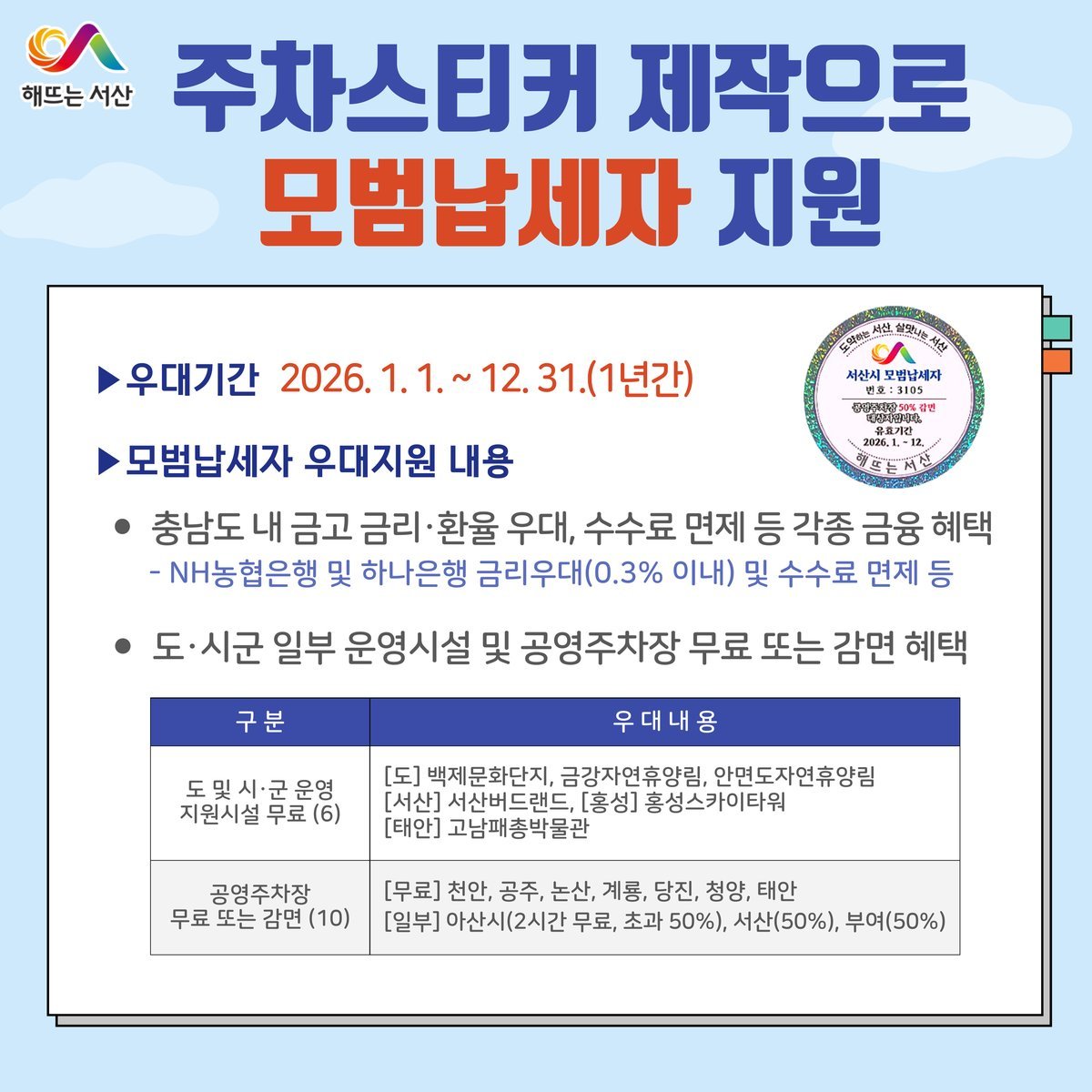 [충청25시] 충남 서산시는 성실 납세 문화를 촉진하기 위해 ‘모범납세자 주차스티커’를 제작해 배부할 예정이라고 밝혔다.