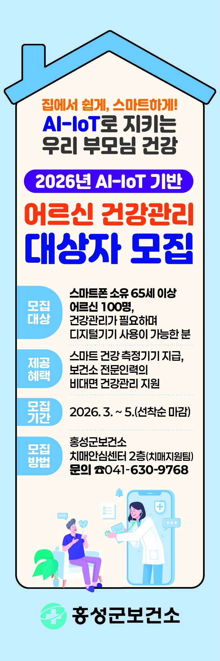 [충청25시] 홍성군은 어르신 만성질환 예방과 건강한 노후 생활 지원을 위해 2026년 AI, IoT 기반 어르신 건강관리사업 의 참여 대상자 100명을 모집한다고 밝혔다.